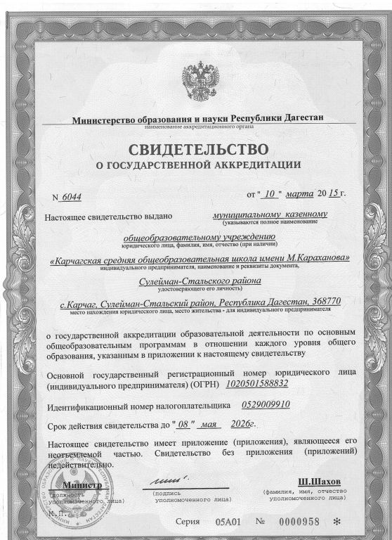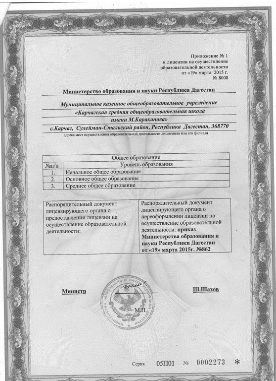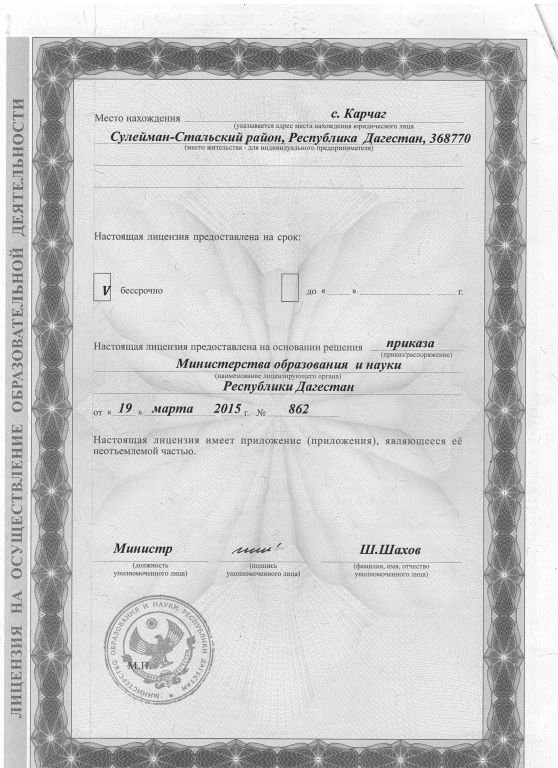 | Адрес местонахождения образовательной организации* | 368770 Республика Дагестан, Сулейман-Стальский район, с.Карчаг ул.ШКОЛЬНАЯ 45 |